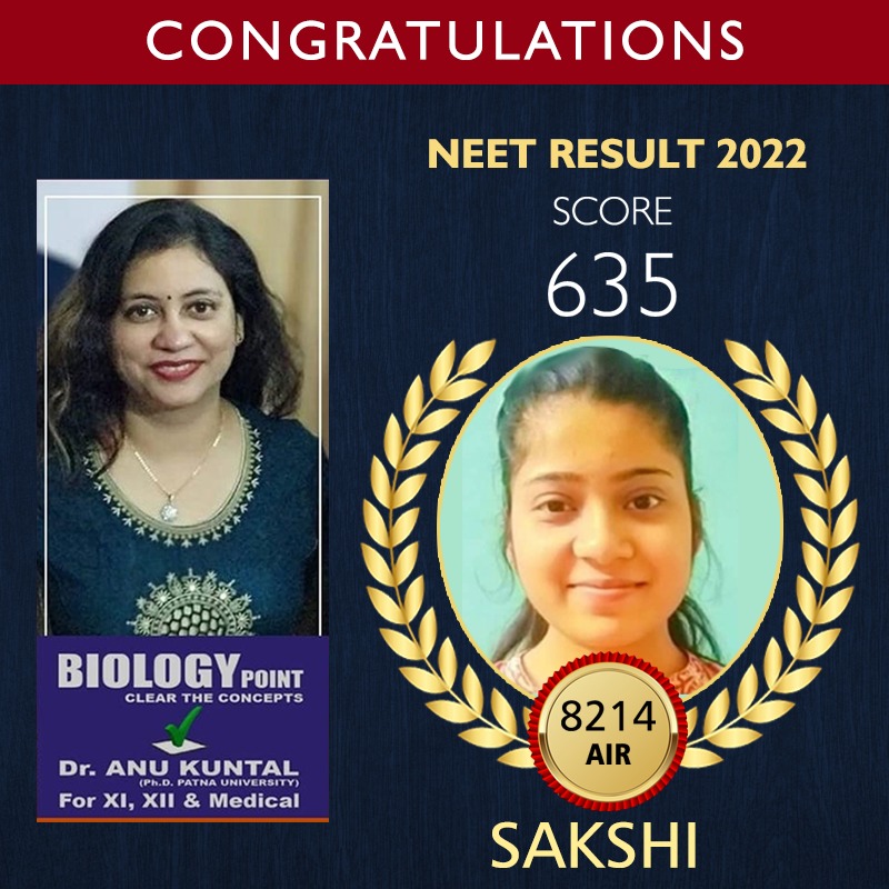 It announces the success of a student named Sakshi, who scored 635 marks and achieved an All India Rank (AIR) of 8214 in the NEET examination.